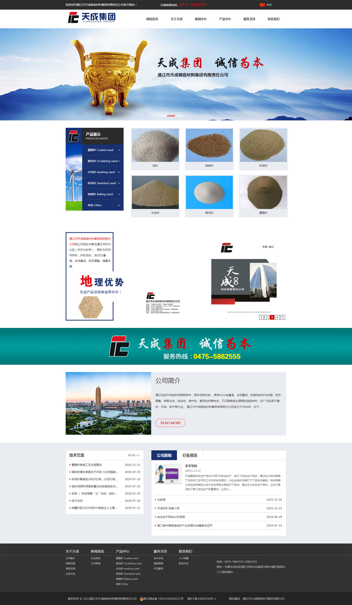 通遼市天成鑄造材料集團(tuán)有限責(zé)任公司成立于2004年,位于科爾沁大草原的科爾沁砂帶,東北交通樞紐,這里交通便利、環(huán)境優(yōu)美、景色宜人。礦區(qū)位于通遼市科爾沁左翼后旗努古斯臺(tái)鎮(zhèn),礦區(qū)占地面積為0.0246平方公里臨近北京市、河北省、遼寧省距離錦州港300公里左右。公司現(xiàn)有員工100人左右,工程技術(shù)人員30余人。年產(chǎn)覆膜砂5萬(wàn)多噸:年產(chǎn)擦洗砂、水洗砂等其它品種30余萬(wàn)噸。